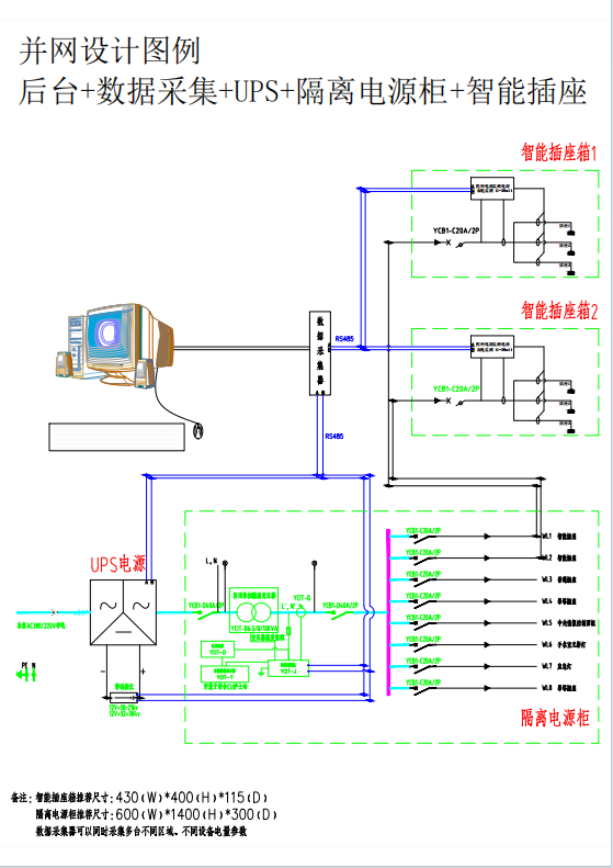 组网模式:后台+数据采集+UPS+隔离电源柜+智能插座箱